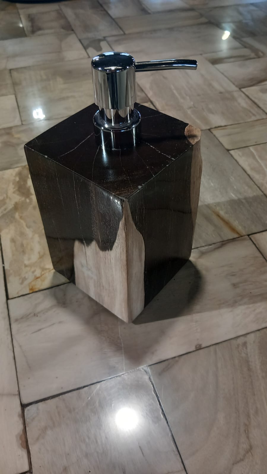 Dozownik do mydła ze skamieniałego drewna.
