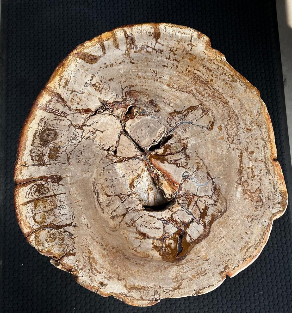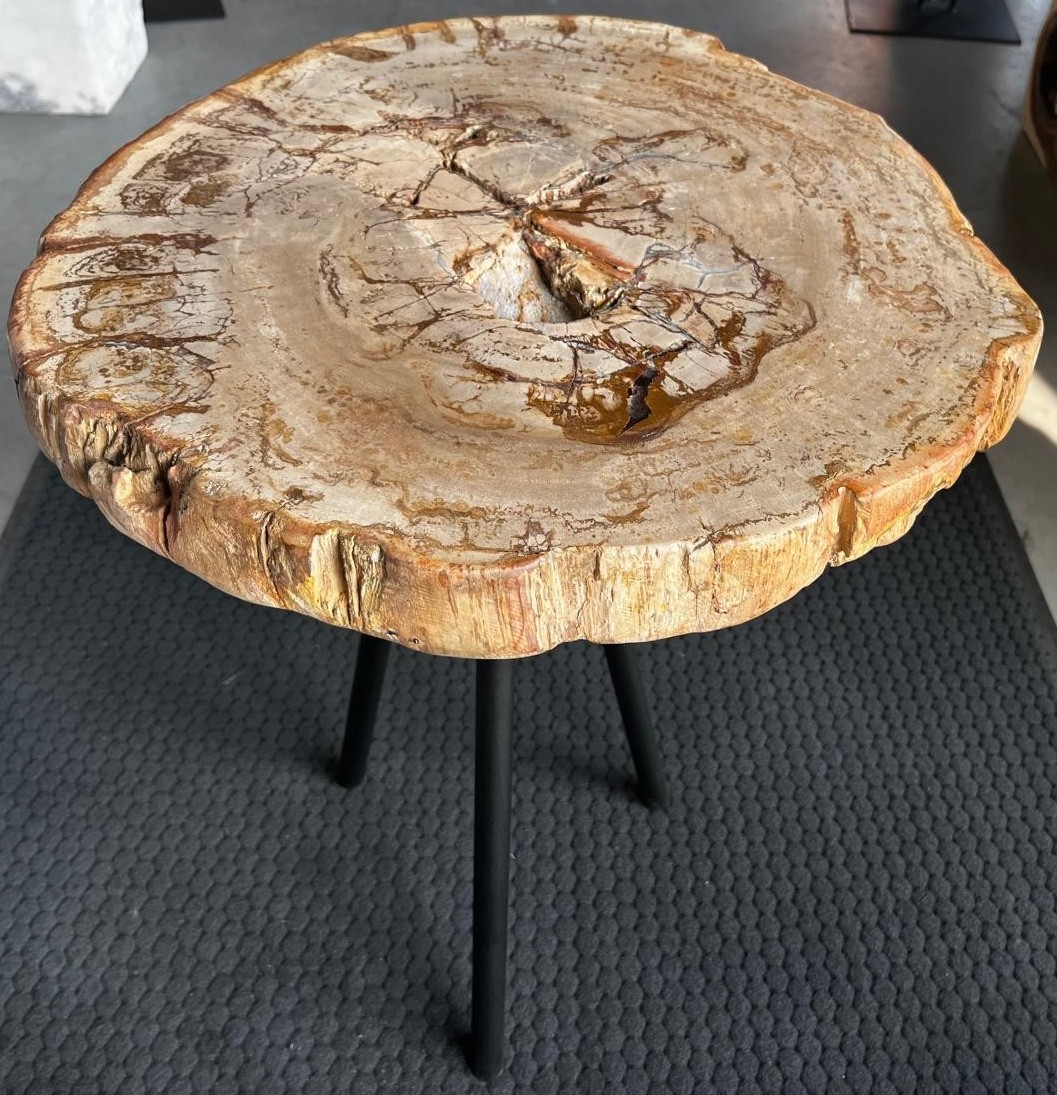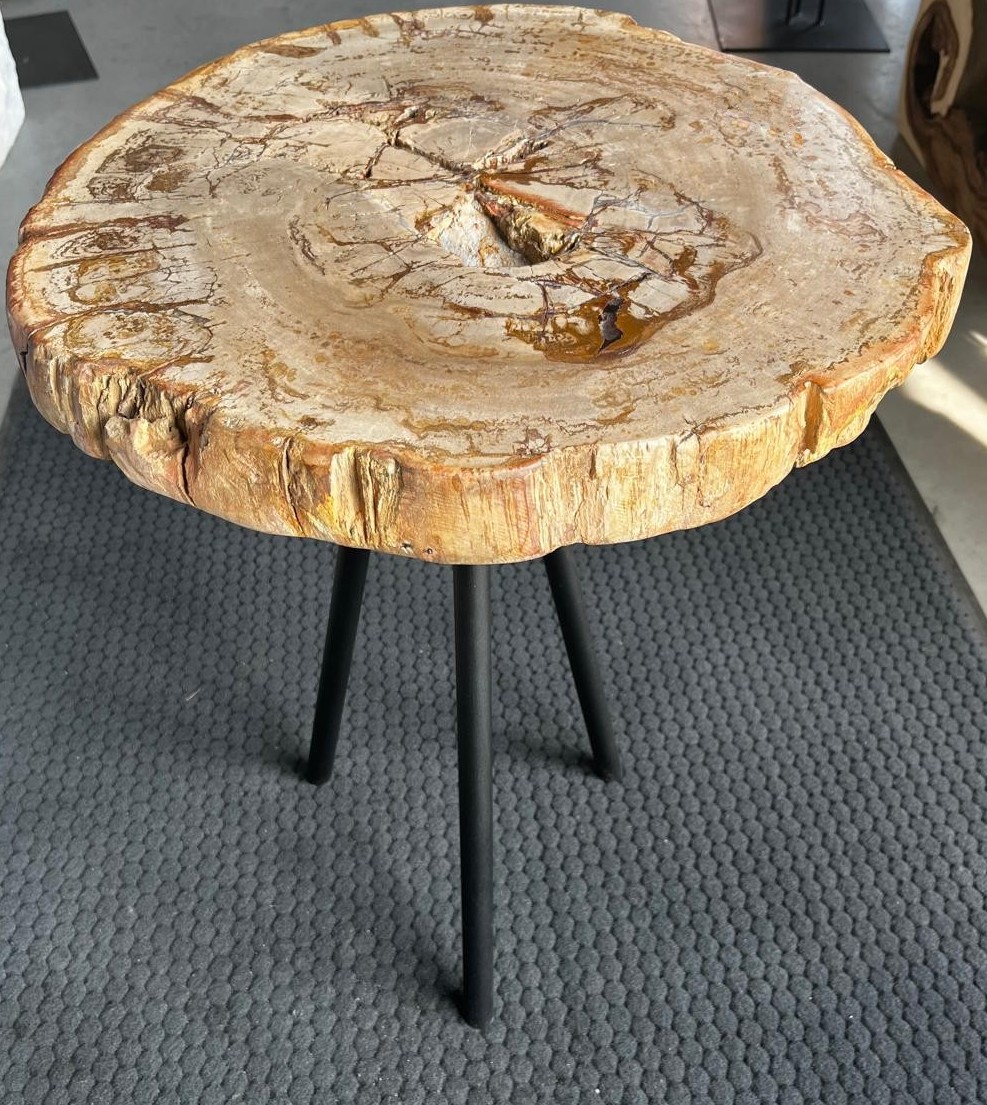 Stolik kawowy ze skamieniałego drewna w odcieniach beżu i brązu.